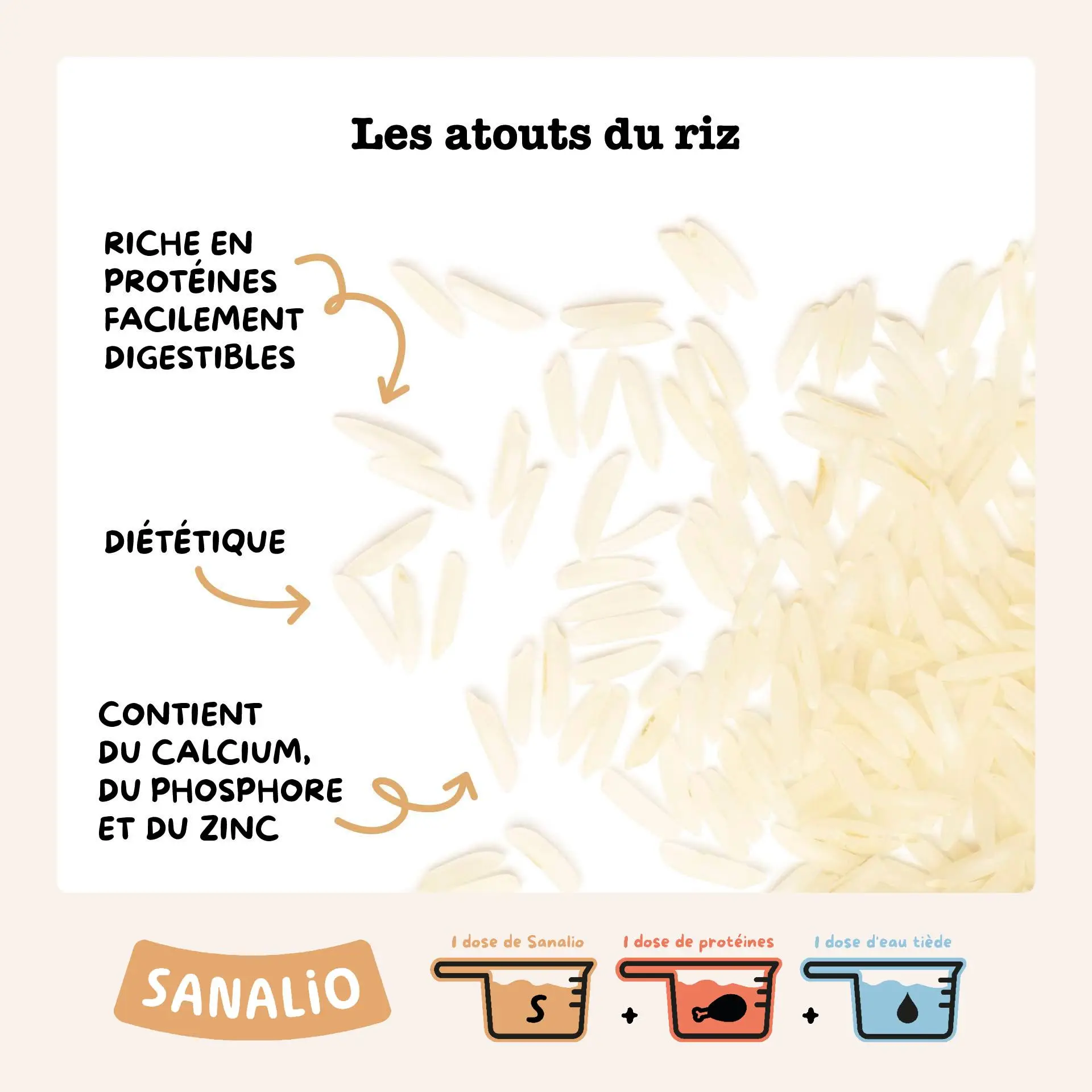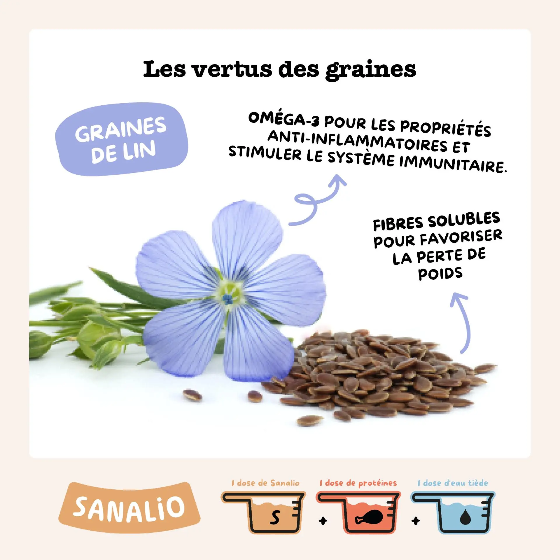 C’est pourquoi Sanalio vous laisse la liberté d’ajouter la source de protéine animale qui convient le mieux à votre compagnon, sans devoir toucher au dosage recommandé.